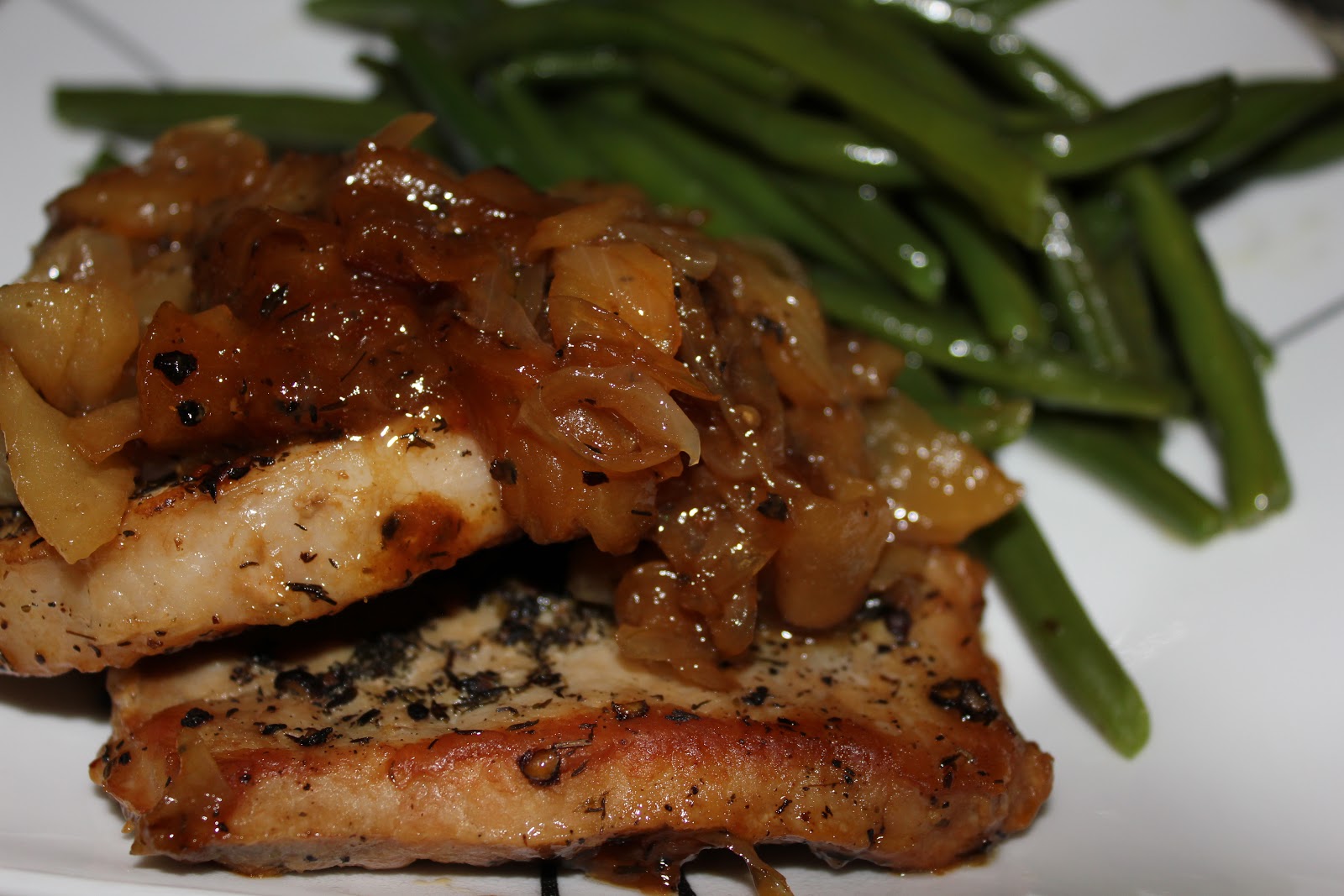 In a large frying pan, heat the oil over medium-high heat. Meanwhile season the pork with salt, pepper, and the thyme. When oil is ready, add the pork to the pan, and cook on first side for 7-8 minutes (or until browned) and then flip for 2 minutes. Remove the pork and set aside (it might not be cooked all the way through, but that's ok). Add the onions to the same pan and season with salt and pepper. When onions start to brown, turn heat to medium-low and continue to cook until caramelized. Add the apples and cook for another 15 minutes or until apples are softened. Turn heat up to medium. Add the cider vinegar and cook while stirring until it's reduced. Add the apple juice and stir until mixture comes to a bubble. Turn heat to lowest setting, add the pork back in, and put a lid on. Continue to simmer until ready to serve (at least another 15 minutes to allow the pork to cook all the way through). Serve pork with onions and apples as a sauce and a side of your favorite veggie (green beans are super on sale right now at Publix).